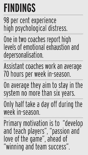 The survey, conducted by researchers from La Trobe University, confirms AFL fears that the second line of coaches are being driven to the point of exhaustion. The league has funded a new full-time career and professional development manager for the AFL Coaches Association, to be filled by former Athletics Australia national coaching manager Michael Poulton, as part of the push to help the assistants.